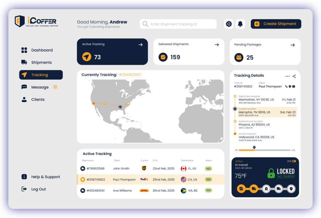 Once you’ve sent your package with iCoffer, our web portal allows you to track its journey in real-time. You’ll have complete visibility over its location, ensuring you always know where your valuable items are. If any tampering is detected, the portal will notify you immediately, allowing you to take swift action to protect your shipment.